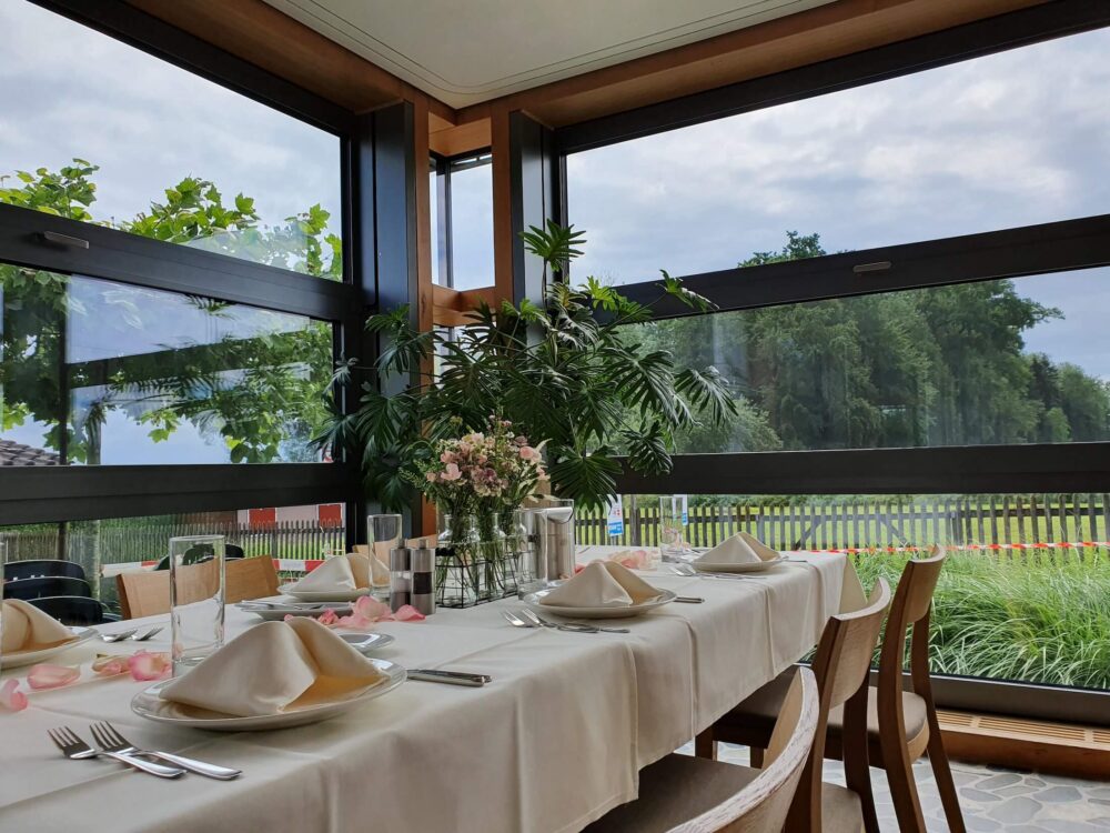 Für Feiern mit 15 – 20 Personen bietet sich dieser gemütliche, helle Raum im Obergeschoss an, der komfortabel per Aufzug erreichbar ist. Geniessen Sie und Ihre Gäste dank der raumhohen Schiebeverglasung die herrliche Aussicht auf den Bodensee.