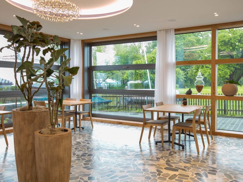Bei angenehmen Temperaturen lässt sich die höhenverstellbare Verglasung komplett im Boden versenken. So entsteht eine grosszügige, geschützte Terrasse mit fliessendem Übergang zum Garten. Der Sitzplatz unter freiem Himmel steht unseren Badi-Gästen und all jenen Besuchern offen, die eine ungezwungene Atmosphäre schätzen.